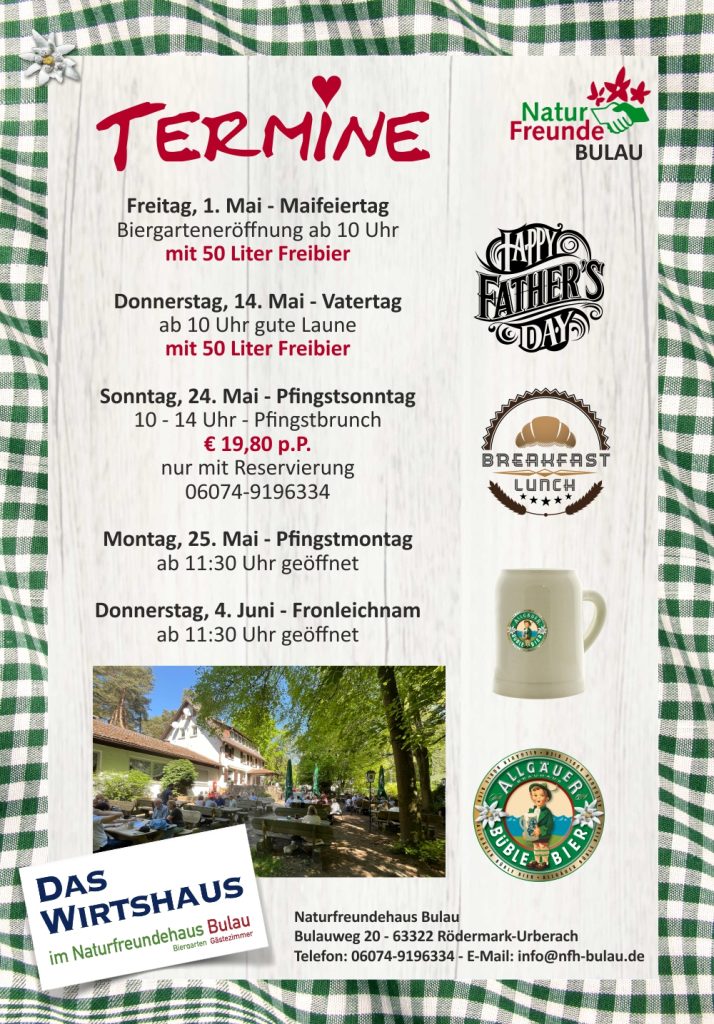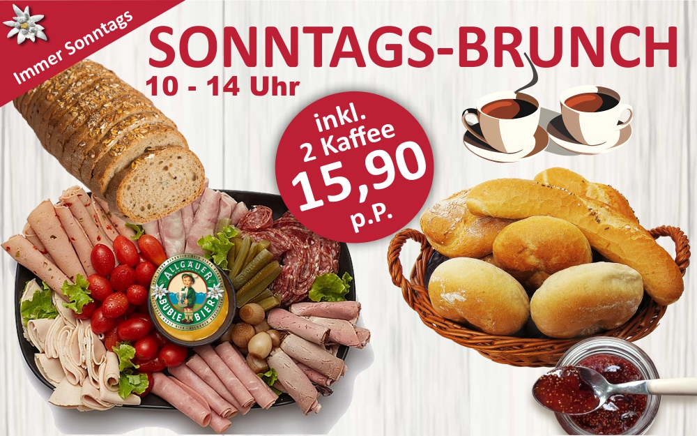 … unser beliebter Sonntagsbrunch von 10°° bis 14°°° Uhr. Brötchenauswahl – Brotauswahl – Käseplatte – Wurstplatte – Schinkenplatte – Rostbratwürste – Räucherlachs und ab 11:30 ein warmes Hauptgericht – Guten Appetit.